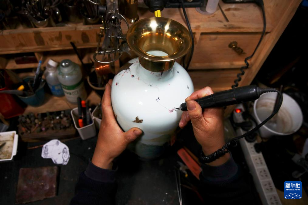 近些年来,杨涛在残瓷器和完整瓷器上进行二次创作,以锔钉镶嵌贵金属图案。“装饰性锔瓷”将原本的修补技艺提升到艺术高度,为这项传统技艺的传承与发展注入新的活力。
