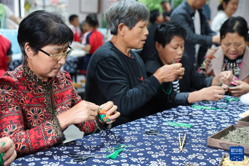 6月5日,老人在东白湖镇东白山村文化礼堂体验制作端午香囊。