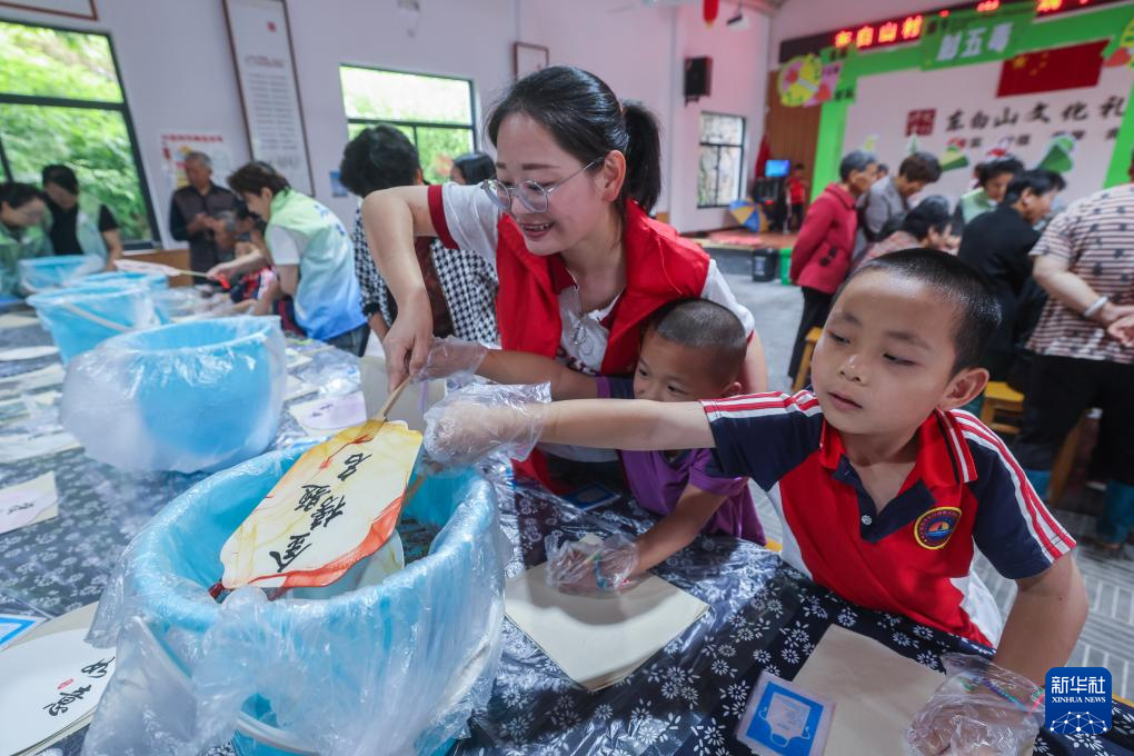6月5日,孩子们在东白湖镇东白山村文化礼堂参加“射五毒”游戏。