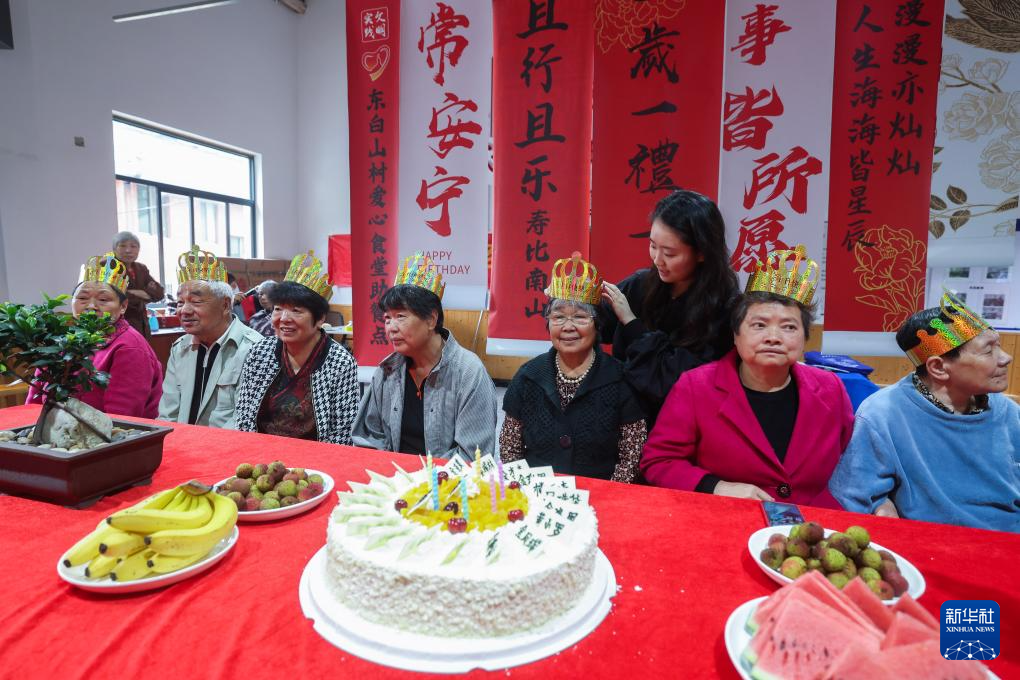 6月5日,老人在东白山村文化礼堂内参加集体生日宴,志愿者为老人送上生日蛋糕。