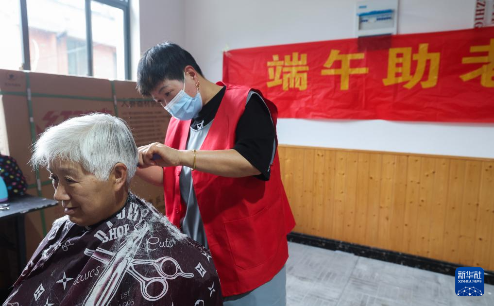 6月5日,志愿者在东白湖镇东白山村文化礼堂给老人义务理发。