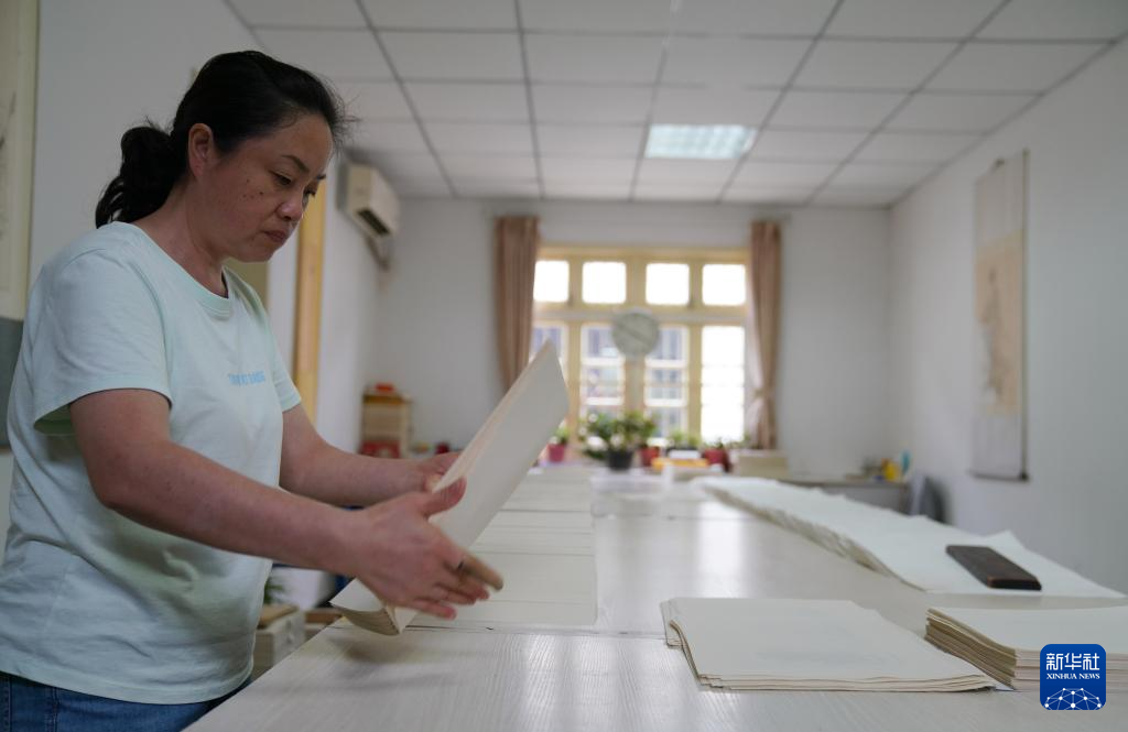 6月27日,在金陵刻经处技艺展示区,工作人员在折页。
