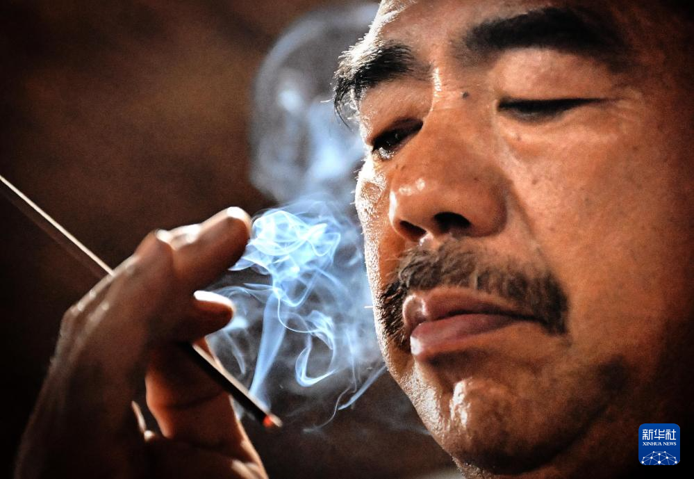 张书芳将制成的线香点燃,进行“品香”,从而检验香品是否合格(7月3日摄)。