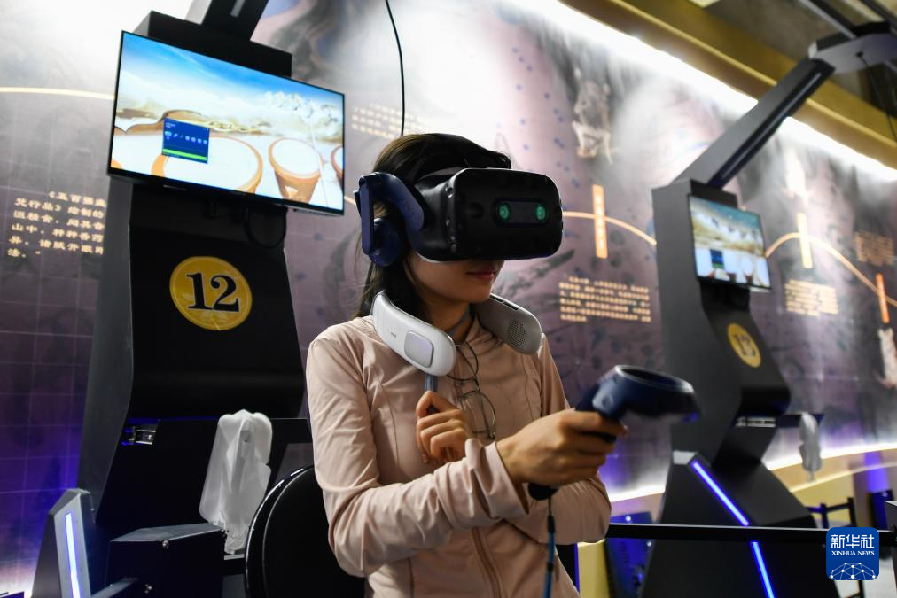 7月22日,游客借助VR设备在莫高窟第285窟虚拟场景中体验擂鼓。