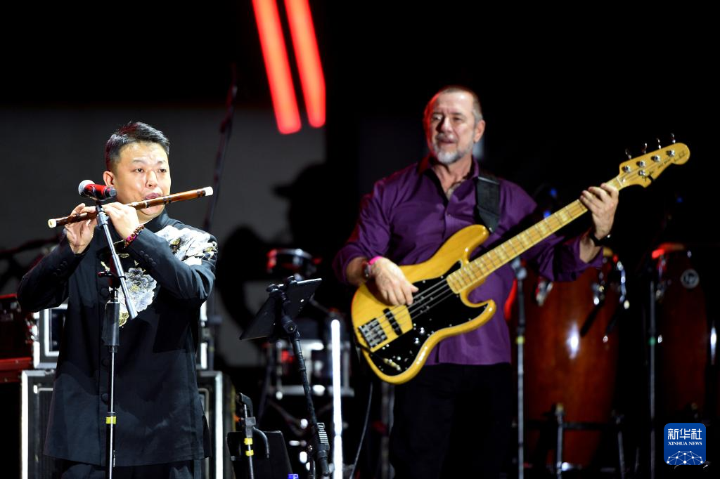 8月17日,在巴西首都巴西利亚,来自中国和巴西的音乐家在沙滩艺术节中国日活动上表演合奏。