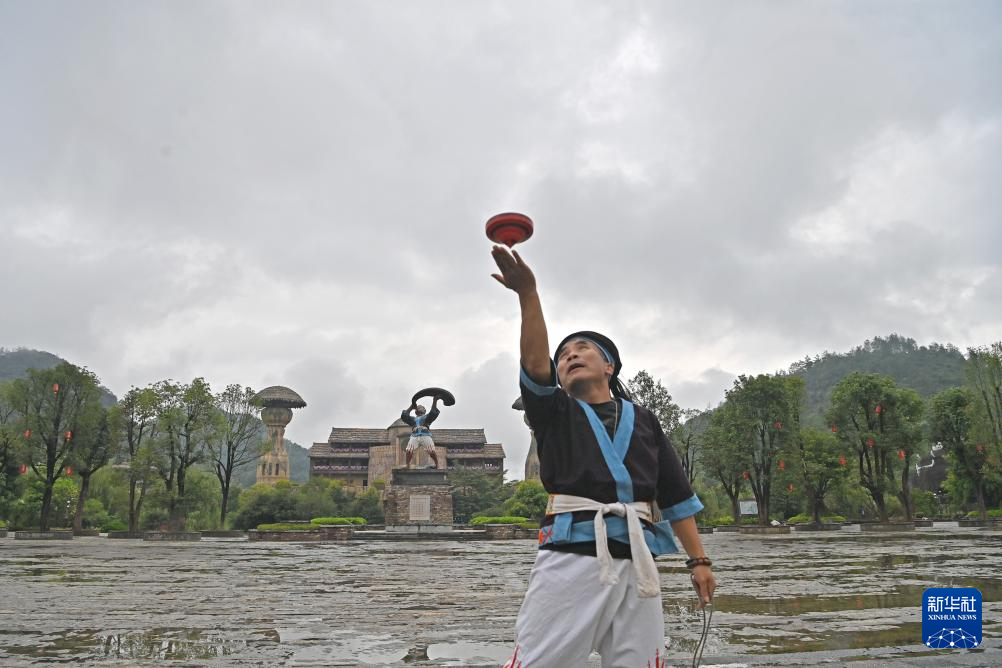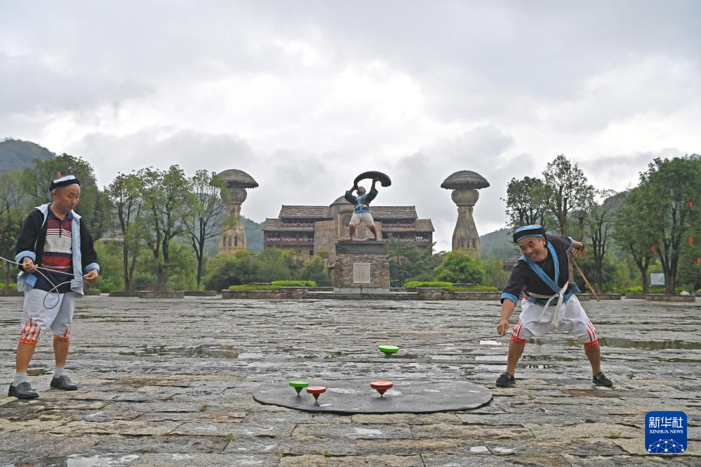 何光斌在南丹县里湖瑶族乡朵努社区表演花样陀螺(8月30日摄)。