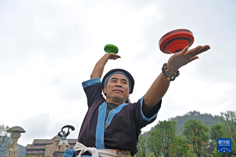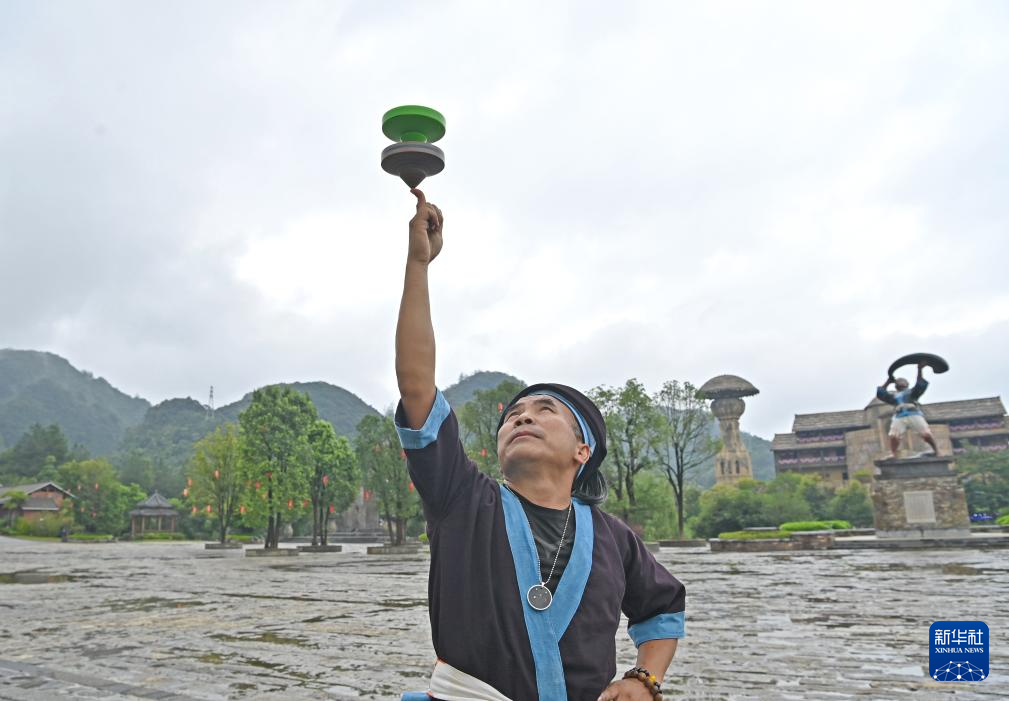 何光斌在南丹县里湖瑶族乡朵努社区展示指尖陀螺(8月30日摄)。