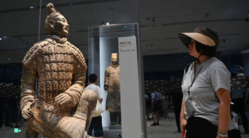 7月16日,游客在甘肃省敦煌市玉门关遗址区观看汉长城。