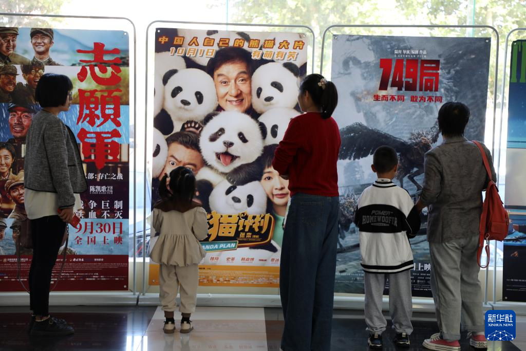 10月7日,观众在山东省博兴县一家影城观看电影海报。