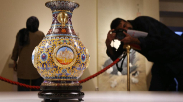 10月12日,在伊朗首都德黑兰的马利克国家博物馆,观众在“丝路长云——中国艺术文化精品展”现场拍摄展品。