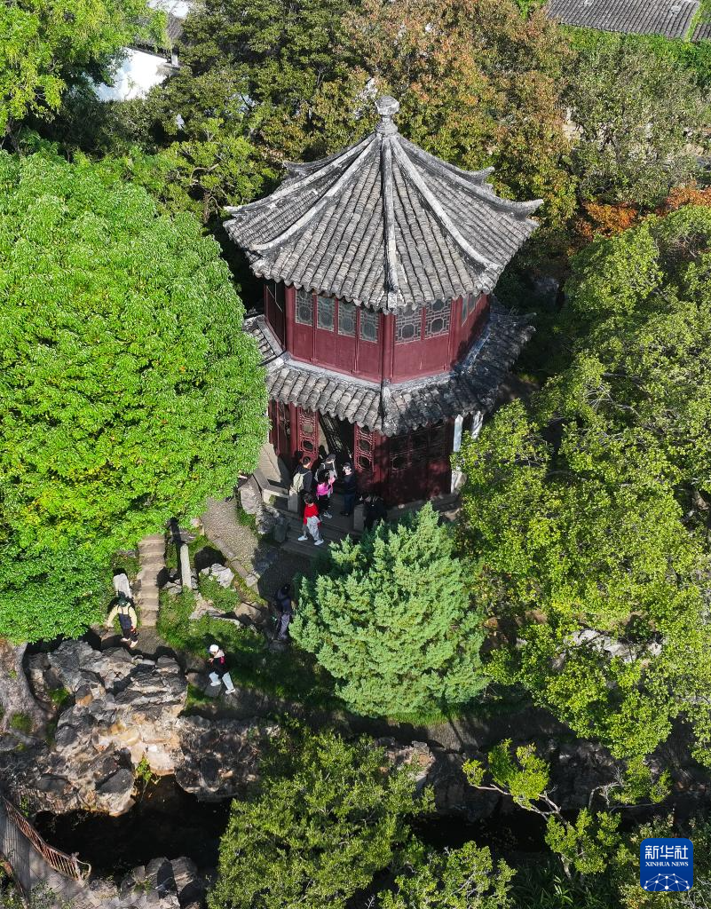 游人在拙政园内游览(10月23日摄,无人机照片)。