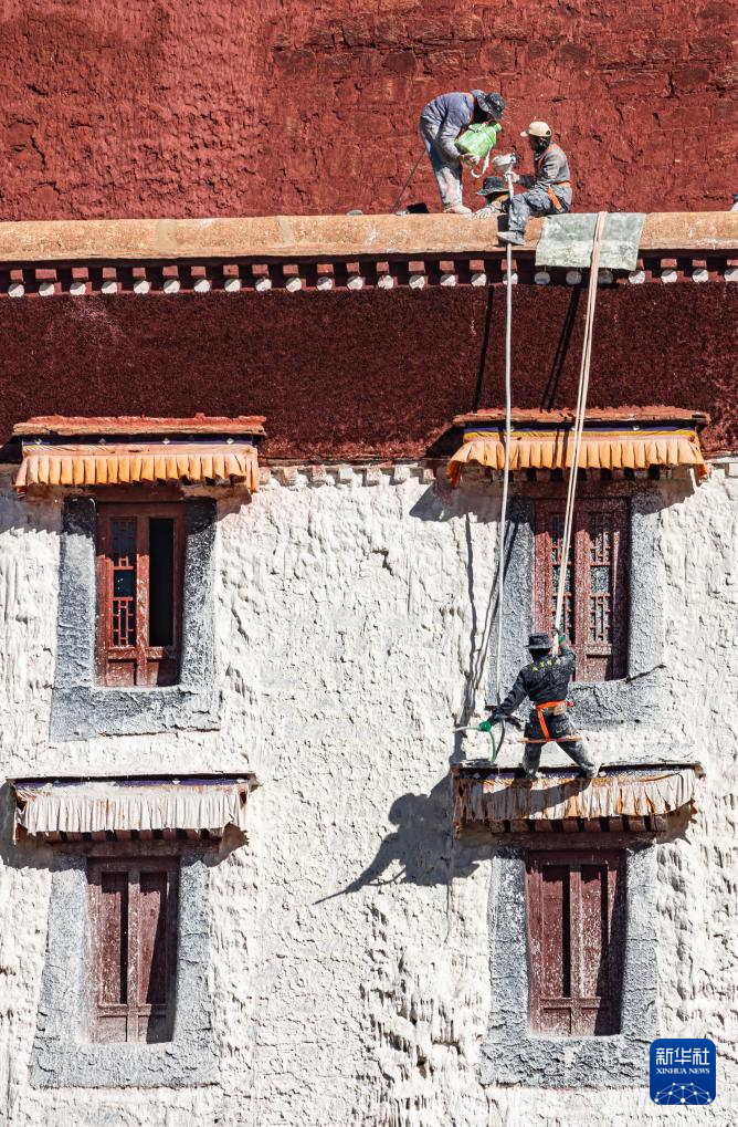 10月30日,布达拉宫管理处的工作人员在喷洒涂料。