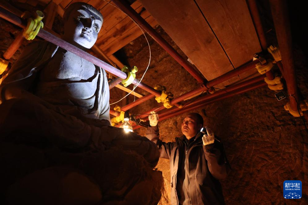 麦积山石窟艺术研究所保护研究室文物修复师何举在麦积山石窟133窟内修复塑像(11月2日摄)。