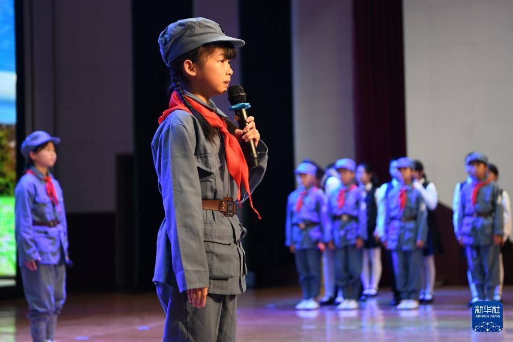 11月13日,在北京市第四中学顺义分校活动现场的思政课上,顺义区马坡中心小学校的学生表演诗朗诵《致先辈》。