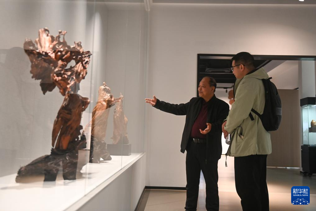 虞金顺(左)在艺术馆展示介绍自己创作的乐清黄杨木雕作品(11月25日摄)。