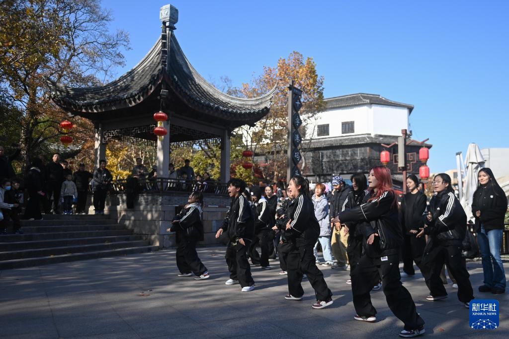 12月8日,新疆大学学生在南浔古镇表演融入新疆舞蹈元素的街舞。