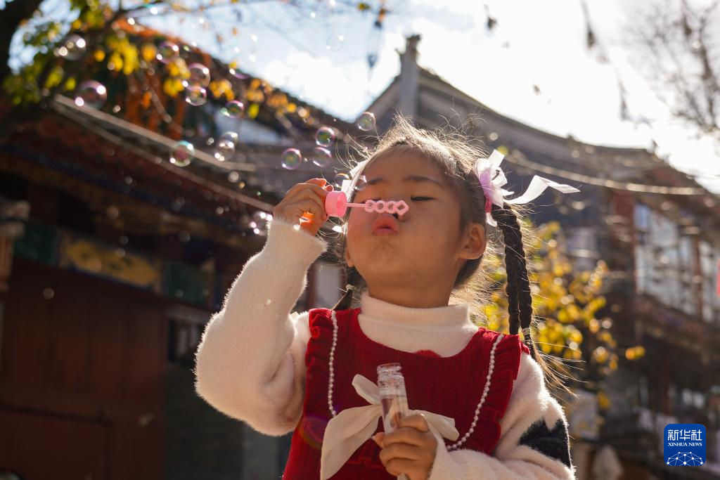 12月8日,两名小朋友在官渡古镇玩泡泡。