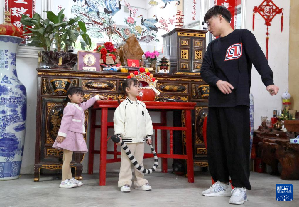 12月9日,庄恩琪在爷爷和爸爸指导下跳英歌。