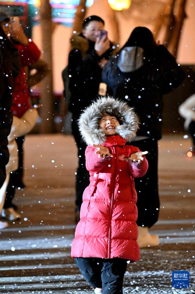 12月18日晚,一名小朋友在正定县荣国府影视基地体验冬雪情景。