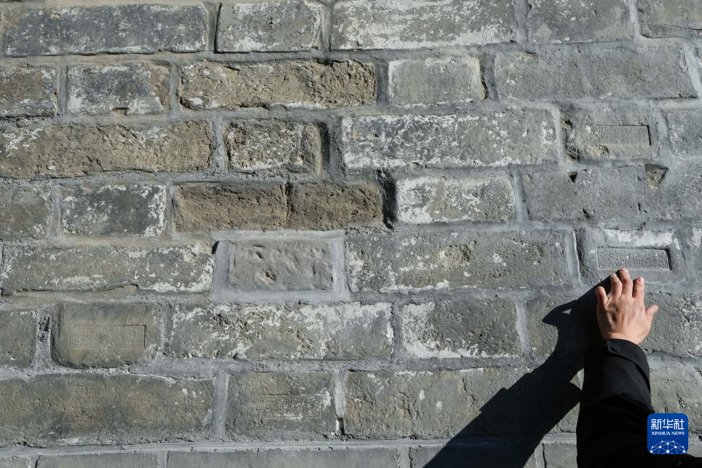 12月26日,参观者在正阳门箭楼下参观城砖上的铭文。