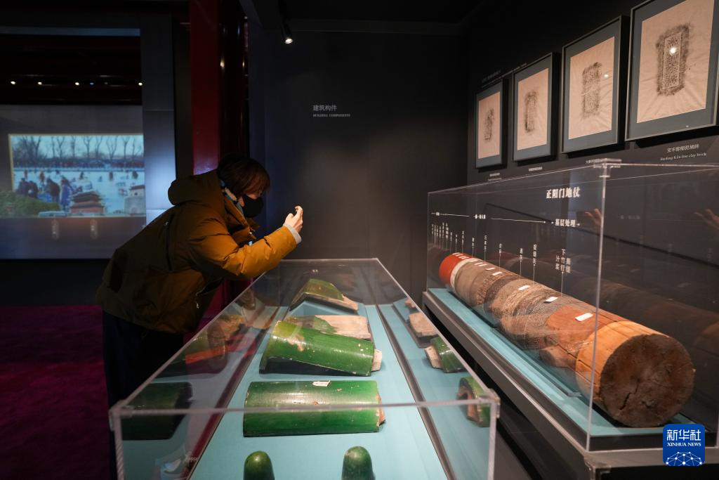 12月26日,参观者在正阳门箭楼内参观展出的建筑构件。