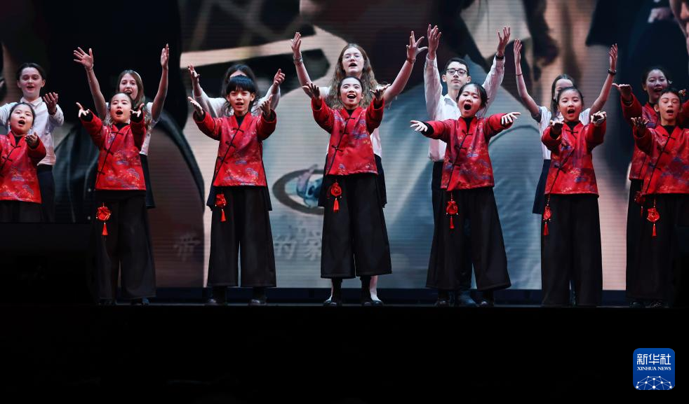 1月20日,在法国巴黎举行的“金蛇献瑞”巴黎春节联欢晚会上,中法青少年合唱《歌声与微笑》。