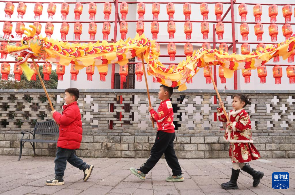 1月23日,在浙江省湖州市德清县乾元镇余不弄,德清县中心幼儿园的小朋友在舞龙。
