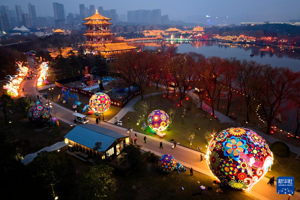 1月22日晚拍摄的西安大唐芙蓉园内的巨型彩灯(无人机照片)。