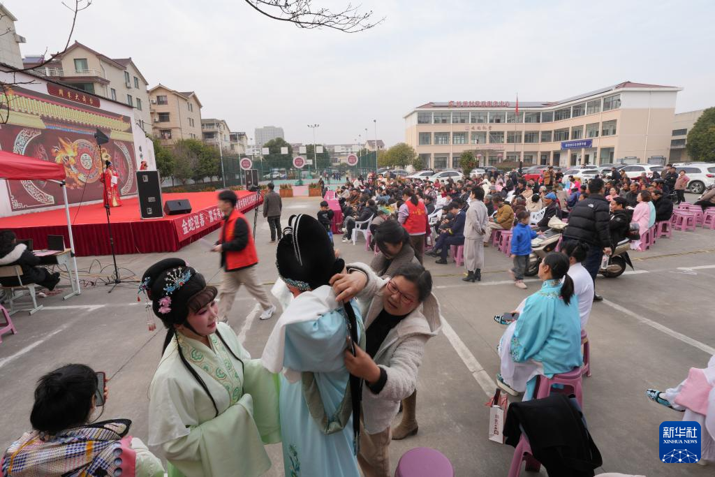 绍兴市柯桥区夏履镇莲增村村民在村口的戏台前观看民间越剧团晶蕾艺术团表演的越剧《五女拜寿》(1月25日摄)。