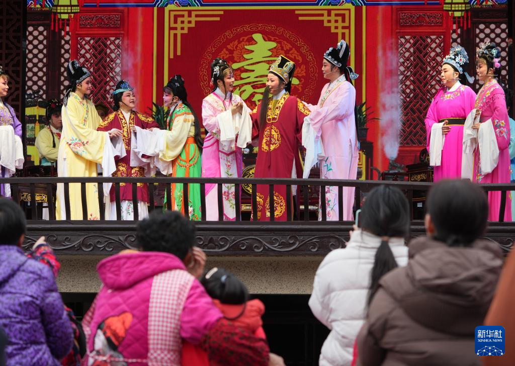 在绍兴市越城区,演员在“绍兴古城过大年”活动上表演越剧《何文秀》选段(1月29日摄)。