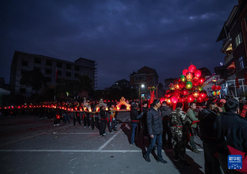 2月10日,赤松镇虎岩村村民抬着板凳龙在村里巡游。