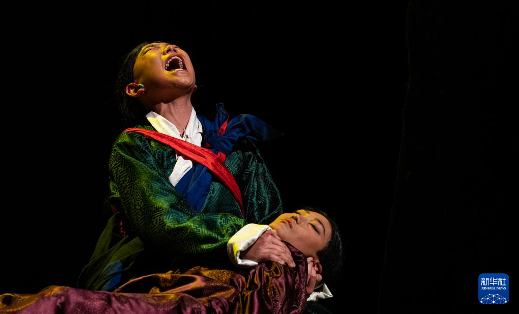 西藏首部少儿舞台剧藏戏《顿月顿珠》演出现场;罗桑朗觉(右)饰演“顿月”,旦增梦朗(左)饰演“顿珠”(2月11日摄)。