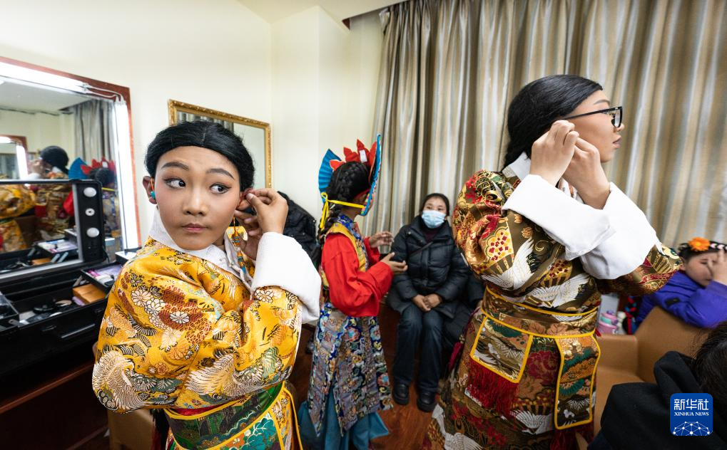 小演员在准备演出舞台剧藏戏《顿月顿珠》(2月11日摄)。