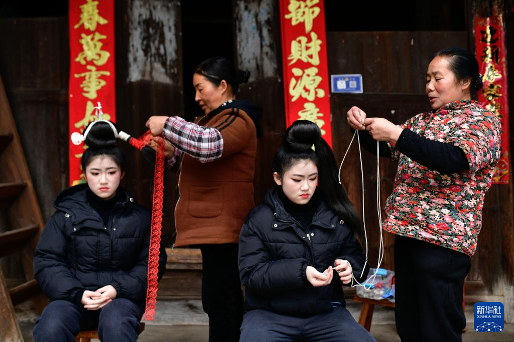 在贵州省凯里市舟溪镇舟溪村茶林苗寨,长辈在帮助双胞胎姐妹杨柠羽(左一)、杨柠竹(左三)绑扎发髻(2月15日摄)。