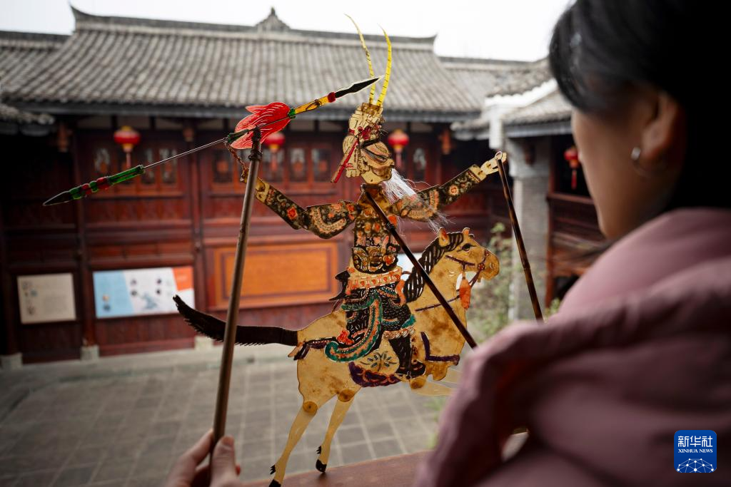在位于阆中市的四川王皮影艺术博物馆,王彪为观众表演皮影戏《千里走单骑》(2月19日摄)。