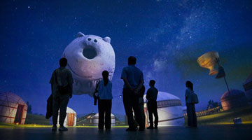 9月3日,在北京市朝阳区邮票公司,销售人员向小朋友介绍纪念邮票。