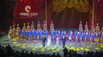 11月2日,绣娘代表在湖北省宜昌市秭归县屈原故里景区芈绣馆前展示她们的作品。