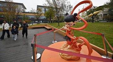 11月5日,在成都天府国际动漫城,与三星堆博物馆合作的文创产品策划运营师曾舟在摆放自己设计的三星堆文创盲盒新品。