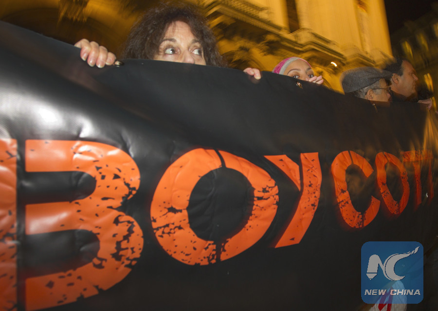 (FILE PHOTO)French demonstrators and supporters of Palestinians held a placard with the word "Boycott" during a demonstration in Paris, France, on Oct. 31, 2012.The BDS movement advocates boycotts, divestment and sanctions against Israel in what its supporters say is a nonviolent way to promote the Palestinian struggle for independence. (AP PHOTO)