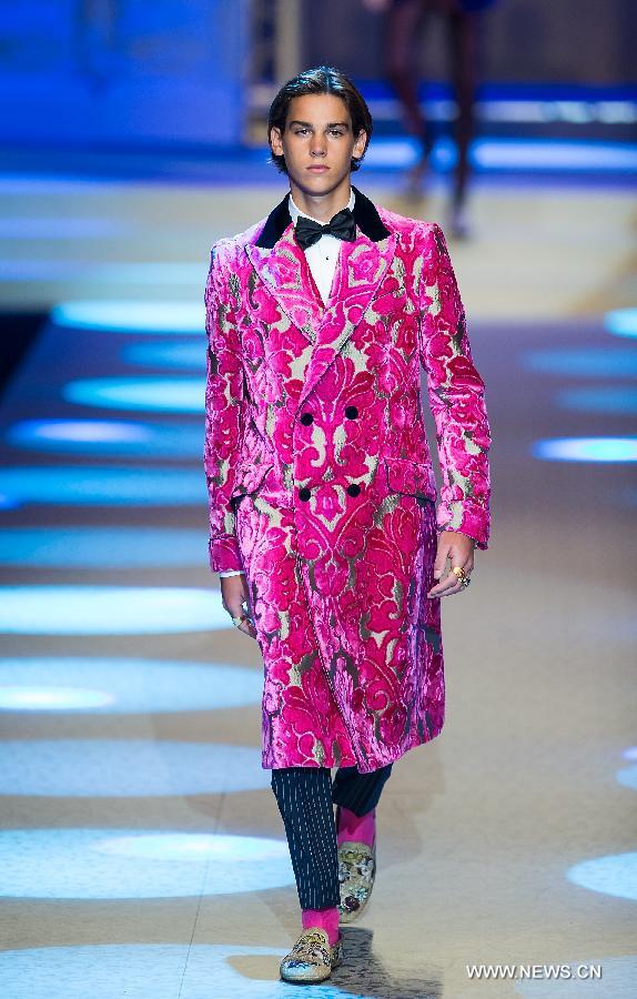 A model presents creations for fashion house Dolce&Gabbana during Milan Men's Fashion Week Fall/Winter 2018/19 in Milan, Italy, Jan. 13, 2018.(Xinhua/Jin Yu)