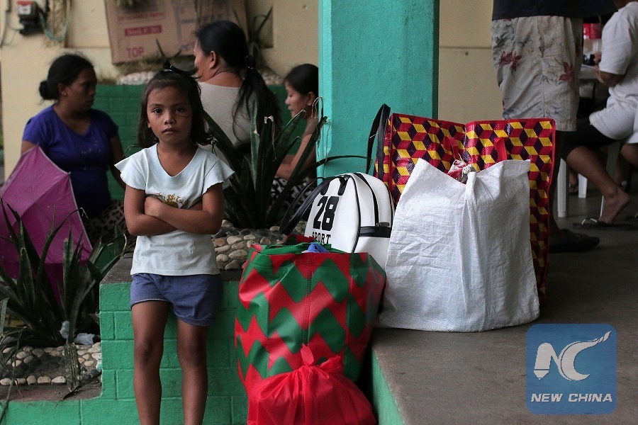 Residents rest with their belongings after they flee from their homes and take shelter inside a public school turned into an evacuation center in Albay Province, the Philippines, Jan. 14, 2018. (Xinhua/Stringer)