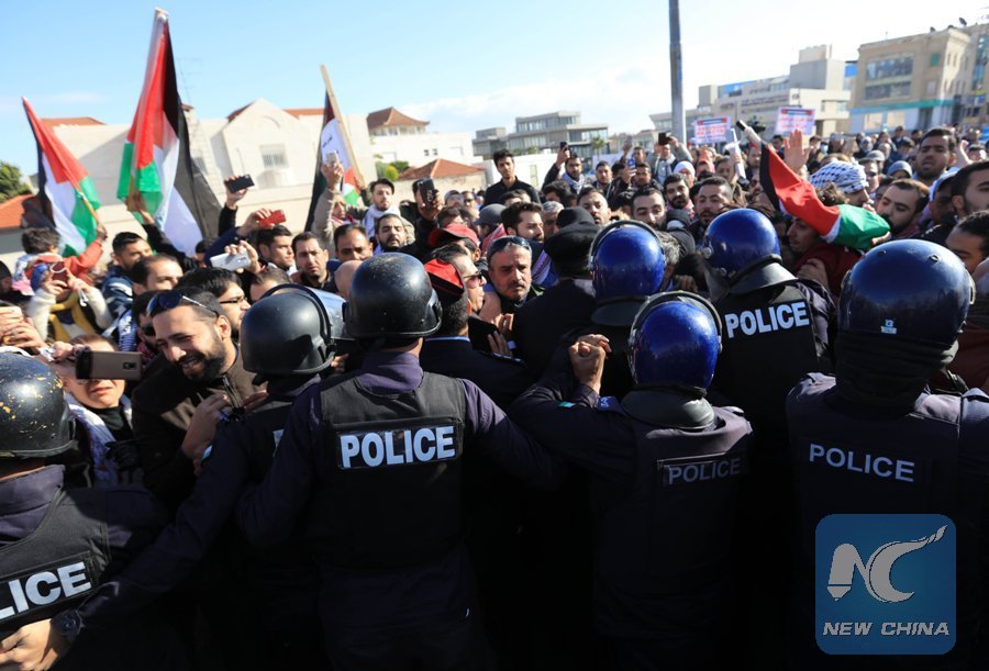 Protesters shout slogans near the U.S. Embassy in Amman, Jordan, on Dec. 7, 2017. People took part in demonstrations in Jordan to protest against U.S. President Donald Trump's decision to recognize Jerusalem as the capital of Israel and move the U.S. Embassy from Tel Aviv to Jerusalem. (Xinhua/Mohammad Abu Ghosh)