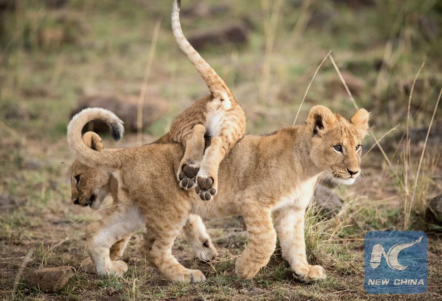 Lion cubs play at the Maasai Mara National Reserve, Kenya, Aug. 28, 2017. (Xinhua/Lyu Shuai)