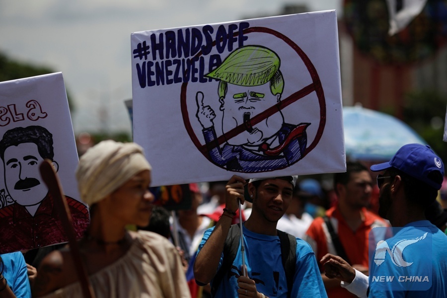 A supporter of Venezuela's President Nicolas Maduro holds a placard depicting U.S. President Donald Trump during a rally against imperialism in Caracas, Venezuela Sept. 19, 2017. (Xinhua/REUTERS)
