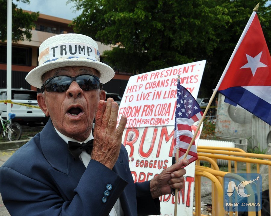 A man holds signs referencing U.S. President Donald Trump's policy on Cuba, June 16, 2017 in Miami, Florida. (Xinhua/AFP)