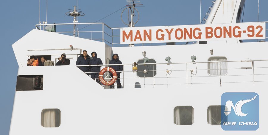 The passenger ferry Mangyongbong-92, carrying performing squad of the Democratic People's Republic of Korea (DPRK), arrives at the Mukho Port in South Korea's eastern coast, on Feb. 6, 2018. The 140-member Samjiyon orchestra is slated to hold concerts in Gangneung, an east city near PyeongChang where the 23rd Winter Olympics and Paralympic Games will be held, on Thursday and in South Korea's capital Seoul on Sunday to celebrate the Winter Olympics. (Xinhua/Lee Sang-ho)