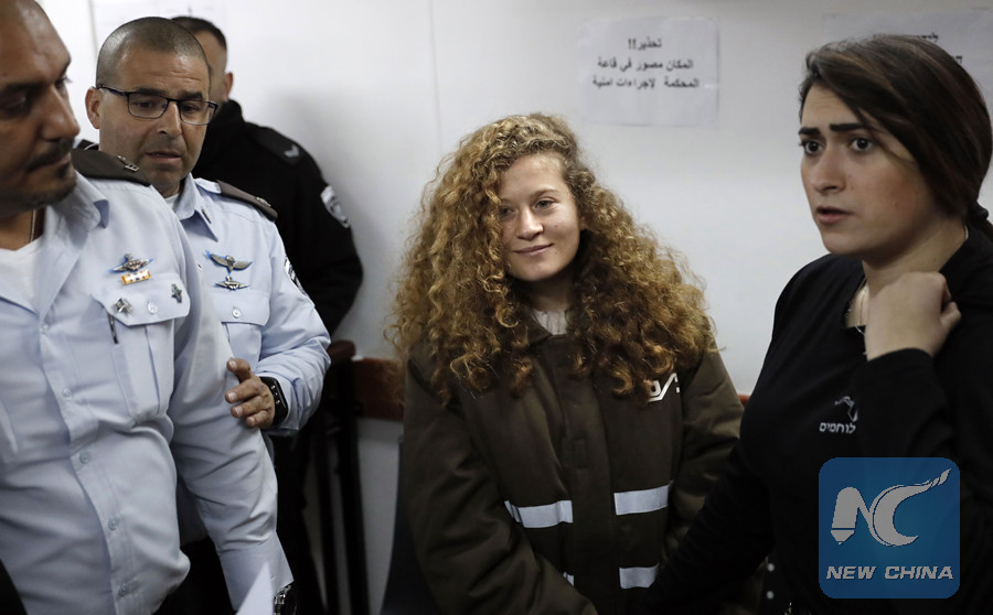 Sixteen-year-old Palestinian Ahed Tamimi (2-R), a well-known campaigner against