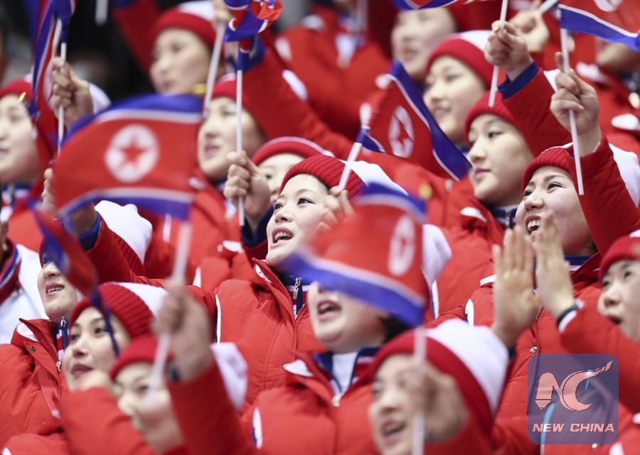 Cheerleaders of the Democratic People's Republic of Korea (DPRK) cheer during the pair skating short program of figure skating at the 2018 PyeongChang Winter Olympic Games, in Gangneung Ice Arena, South Korea, on Feb. 14, 2018. (Xinhua/Lan Hongguang)