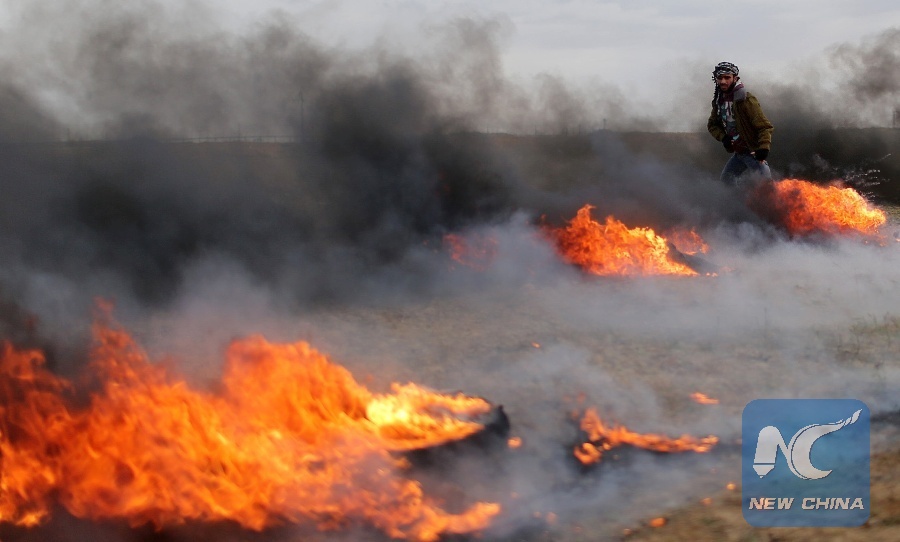 A Palestinian moves a burning tire during clashes with Israeli troops, as Palestinians call for "a day of rage" against U.S. President Donald Trump's decision over Jerusalem, near the border with Israel in the southern Gaza Strip January 26, 2018. (Xinhua/REUTERS)