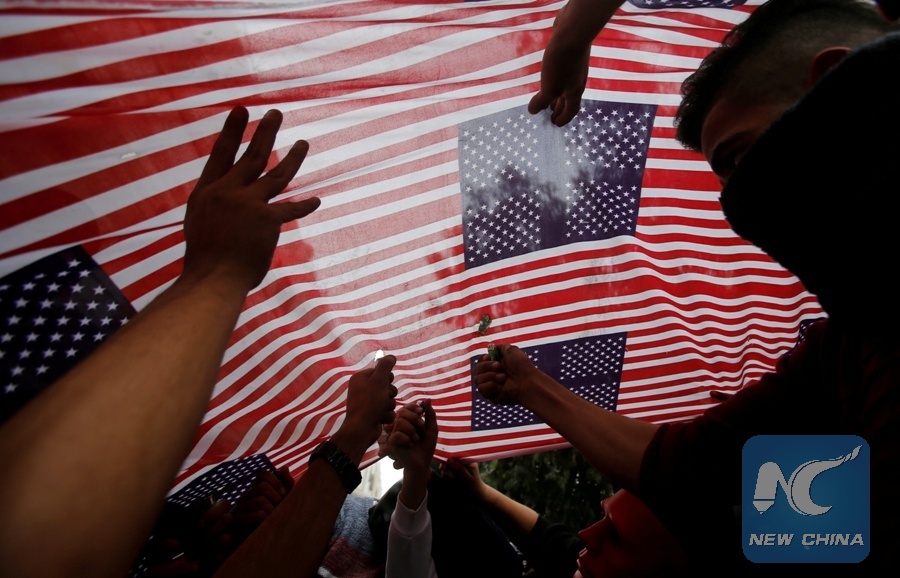 Palestinian demonstrators set fire to a representation of a U.S. flag during clashes with Israeli troops, at a protest as Palestinians call for a "Day of Rage" in response to U.S. President Donald Trump's recognition of Jerusalem as Israel's capital, in the West Bank city of Hebron, Dec. 22, 2017. (Xinhua/REUTERS)